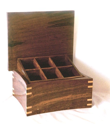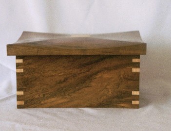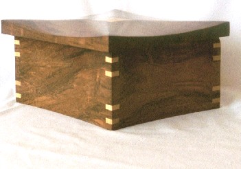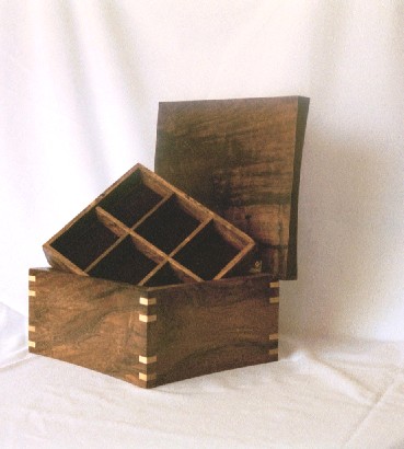 The two boxes are very similar - measuring about 9 " W by 11" L and 5" high. They are constructed with splined miter joints. A miter joint is (typically) two 45 degree edges joined to form a 90 degree corner. It's not a particularly strong joint, so the small maple splines are added to hold the corners together. By making the splines from a contrasting wood, the joint becomes part of the decorative elements of the box.
