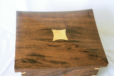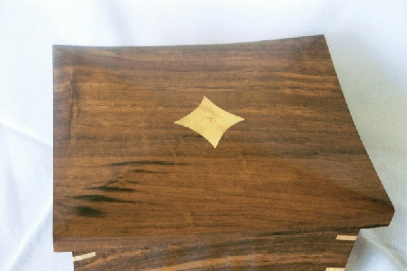 I added small inlays to the box tops to add some interest. The inlays are made from birdseye maple. To preserve the natural color of the imbuia and the contrast with the maple, I used a French polished super-blonde shellac for the finish.