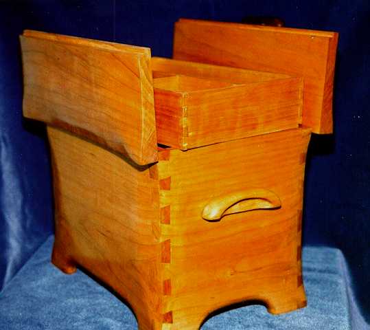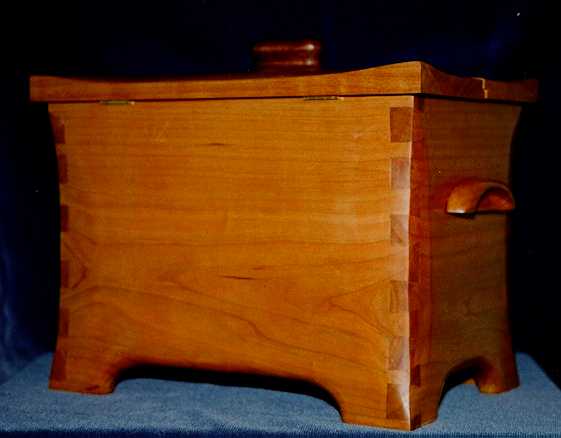 All the dovetails are handcut and the curved sides and top of the box were shaped by hand with a spokeshave, rasps, and files. I decided to experiment with the curves after a visit to the Wharton Esherick studio in Pennsylvania (after which my daughter, Emily, remarked: "Daddy, you have to start making more curves!"). Several people have remarked that the curves make it look somewhat Oriental in style and I agree.
