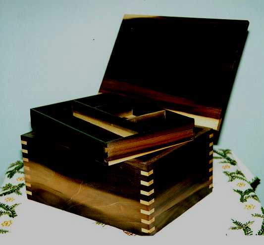 This box is a little larger than most jewelry boxes measuring about 7" high by 11" long and 9" wide. To preserve the contrast between the light and dark colors, I used a clear non-yellow lacquer finish. I rubbed this down to a satin lustre to avoid a thick plastic look that surface finishes can get.