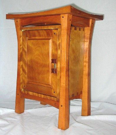 I suggested a design based on the Pagoda chest with a locking door on the front of the cabinet. Necklaces could be hung from pegs on the rear of the door. Jeff liked this idea and I sent him some sketches. Then we got into wood choices and he settled on flame birch in a cherry stand. He wanted there to be less contrast between the birch and the cherry than the natural wood colors would have, so I agreed to stain the birch a little darker. This would highlight the figure in the birch and there still would be some color contrast between the two woods.