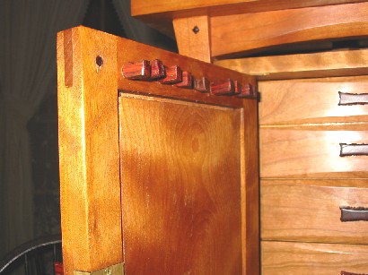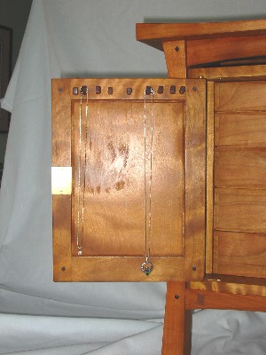 Here's the back of the door showing the cocobolo pegs I carved for the necklaces to hang on. The door and drawer handles are also carved from cocobolo and the pegs for the mortise and tenon joints in the stand and door are also made from cocobolo.