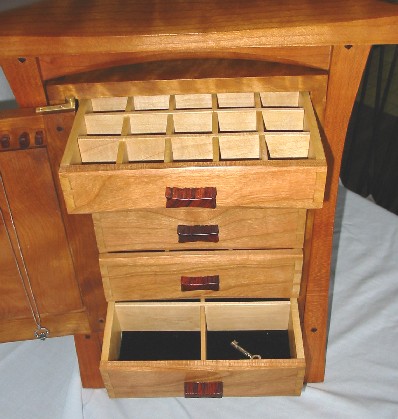 The drawers have cherry fronts with maple sides and backs. The dividers in the drawer are also made from maple. I varied the number of compartments to accommodate different types of jewelry. The drawer bottoms are lined with dark green velvet.