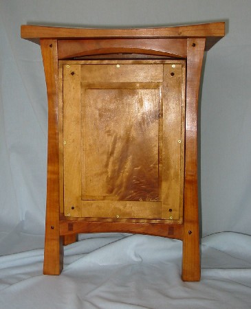 The back of the cabinet is a frame and panel piece made from maple. The maple has some nice figure in it. I don't finish the backs of pieces as nicely as the show sides, but the back of this piece would have looked nice on the front. The panel is secured in the cabinet with small brass screws. I figure in the event that the piece needs to be repaired (a couple of hundred years from now or so), it will be easier to do so if the back can be easily removed.