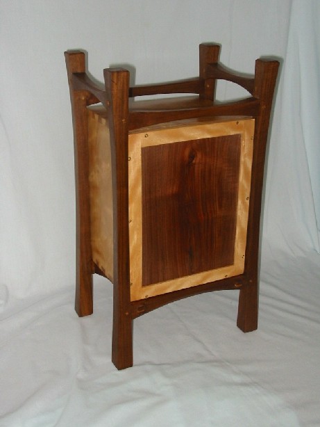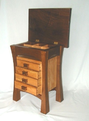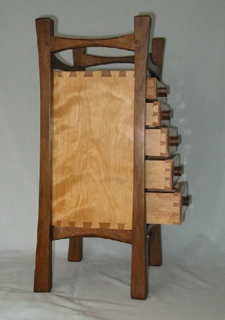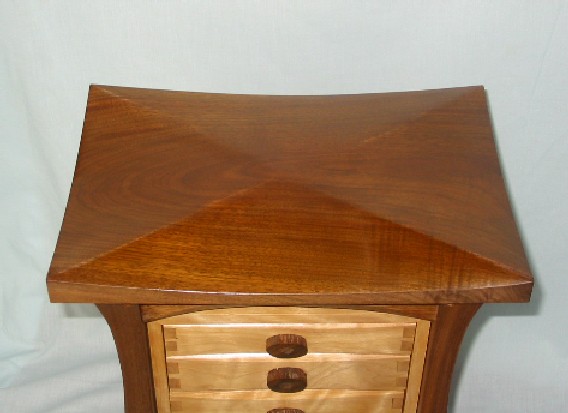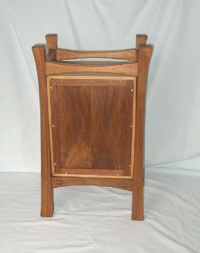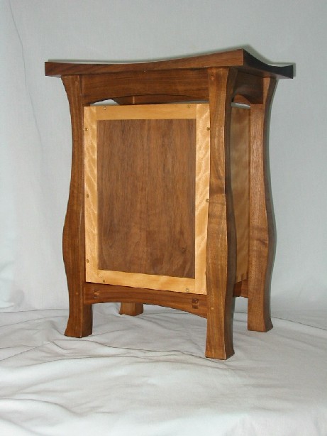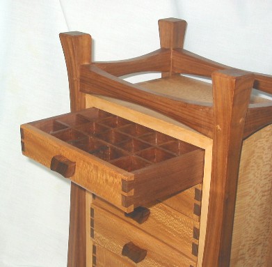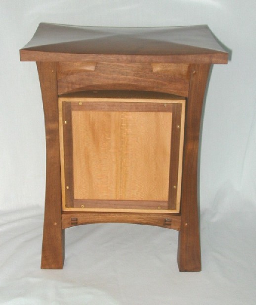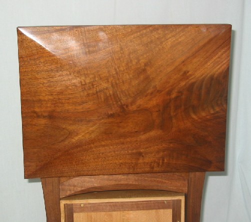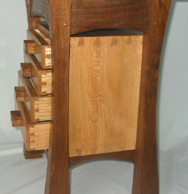 The most unusual feature of this chest is that the top opens and reveals an upper compartment. You can see this in the third thumbnail about. The top is made from a very nice piece of figured walnut. I make the backs of these pieces from a frame and panel piece that is screwed into the back of the piece.