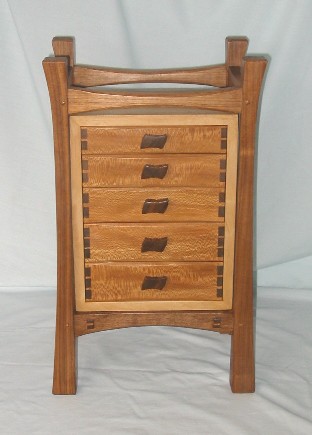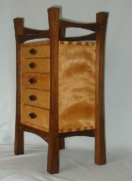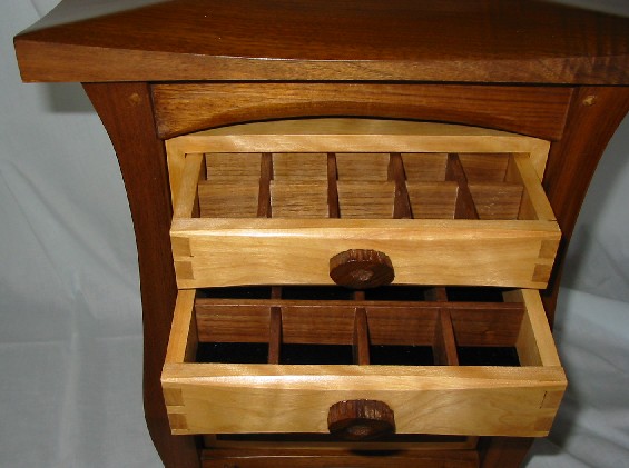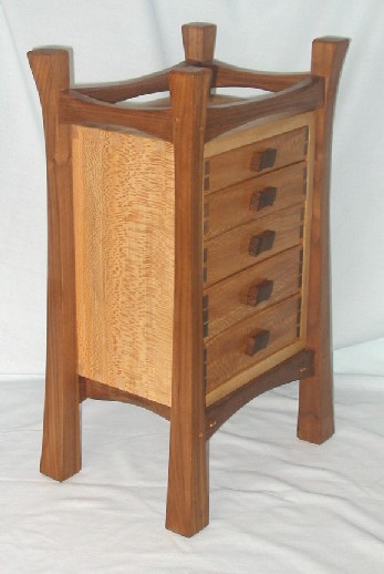 These are several multiple drawer jewelry chests in enclosed stands that were inspired by my original "Pagoda" Jewelry Chest. Some have the curved top similar to the one I used on the Pagoda piece and others are in an open stand. For lack of a better term, I'm calling these "Standing" Jewelry Chests. All feature a central cabinet with 4 -5 drawers set in a standing frame. Most of these are 20 to 24 inches high, about 12 inches wide, and about 9 to 11 inches deep. They hold a lot of jewelry.
