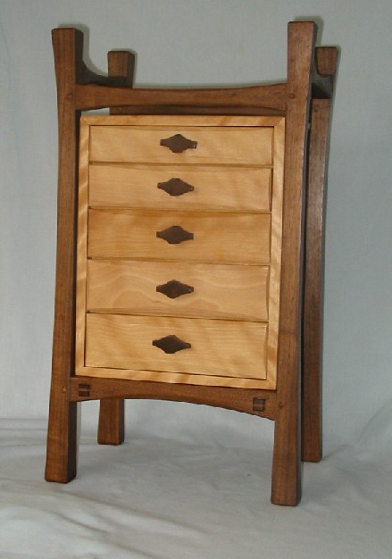This last chest is made from Quartersawn Sycamore and Walnut. The cabinet is set in an open frame.