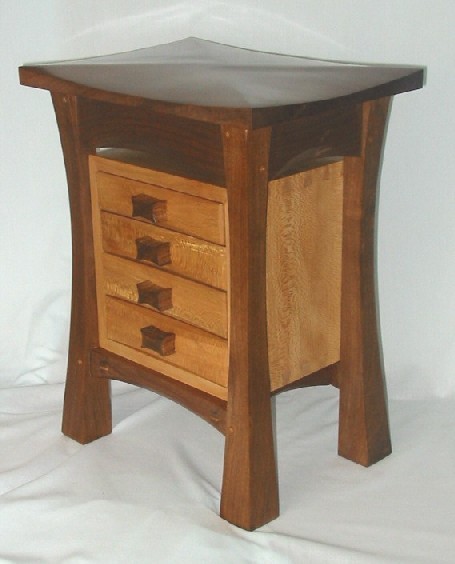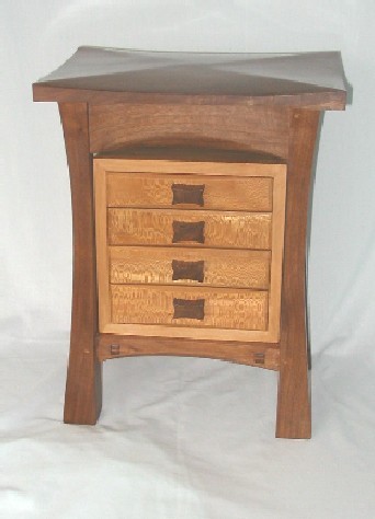 This piece is made from Quartersawn Sycamore in a Walnut Stand. The drawer handles were carved from Imbuia wood and I used oak for the drawer sides and bottoms.