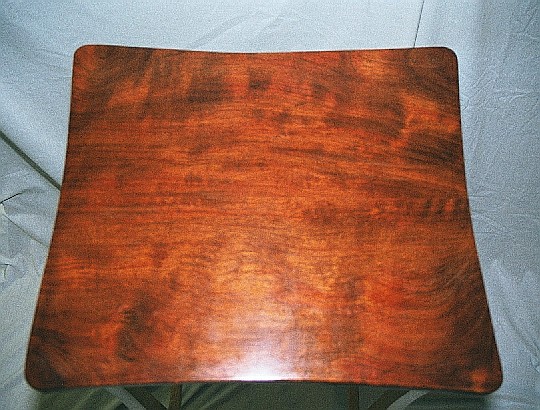 Here's the Bubinga top. I love the color and grain of this wood, but it's exceptionally difficult to work. It's very hard and dense and really beats up tools; I felt like I was working with stone rather than wood. The wood itself takes a real polish with a scraper and fine sandpaper. The final finish is a super-blonde shellac and wax.