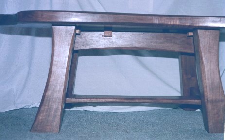 Now some years before this, my good friend, Bill, who owns a portable saw mill, had shown up at my house one summer evening with a small load of walnut. These were short thick boards of green wood. He thought they'd be good for boxes. I stacked and stickered this in my basement and let it dry for two or three years. Every once in a while I'd visit the stack and see how it was doing. After looking it over I saw the makings of some nice thick table legs in the stack and decided on a coffee table with the crotch walnut slab for a top.